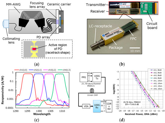 A photograph of the fabricated photoreceiver is shown in Figure 7b along with a photograph of the footprint of the Ethernet transceiver. Viewed from the outside, the receiver consists of a metal hermetically sealed package, a receptacle LC connector with another focusing lens, and flexible printed circuits (FPCs). The core assembly including the AWG and PDs is mounted in the package together with a four-channel TIA on a circuit board. The MM-AWG was fabricated with index difference of 2% with the core width of 5 μm for single-mode input and 15 μm for multimode output. The receiver can be applied for a reach of 10 km by using pin-PD. Furthermore, the reach can be extended by replacing the pin-PD with an APD [35]. The size of the package is 7 × 18 × 6 mm3, excluding the receptacle and FPCs, which is small enough to install it in compact transceivers such as QSFP-DD and OSFP [36,37].