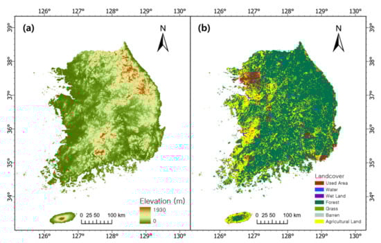 The study area of South Korea with (a) elevation and (b) land cover data. The elevation data come from ALOS World 3D 30m v3.1 [31]. The land cover data were provided by the Ministry of Environment [32].