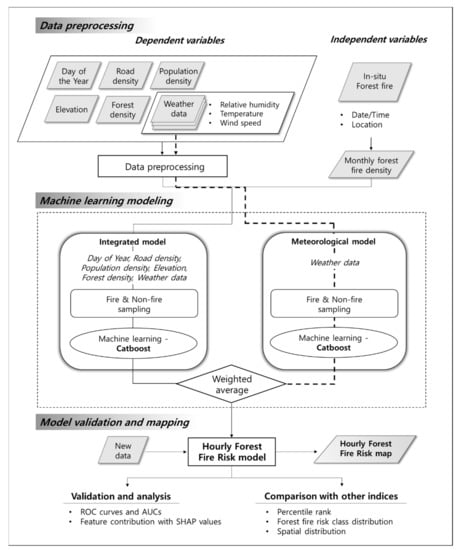 The process flow of this study consists of three main parts: data preprocessing, machine learning modeling, and model validation (Figure 2). The input variables were first preprocessed to have the same spatial extent and resolution. Multicollinearity of the variables was then tested using the variance inflation factor (VIF). Monthly forest fire density through the stratified sampling was finally generated in the preprocessing stage. An ensemble model combining two machine learning models with different input variables was developed in the modeling part. The ensemble model was cross-year validated (One-year-out cross-validation) and further compared to the existing forest fire risk indices. One-year-out cross-validation refers to excluding one-year data for validation and training the model with the remaining five-year data. By repeating this process for each year (i.e., six times), all six years were cross-validated. The spatial distribution of the hourly forest fire risk index was qualitatively evaluated as well.