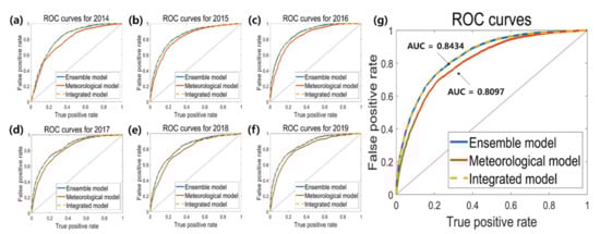 In order to evaluate the ensemble model and to compare it with the individual integrated and meteorological models, the ROC curves of one-year-out cross-validation (Figure 3a–f) and the entire years (Figure 3g) are depicted in Figure 3. Since a large weight (i.e., 80%) was applied to the integrated model when combining two models, it is not surprising to see similar ROC curves between the ensemble and integrated models. When the entire year results were summed, the AUC of the meteorological model was 0.8097, while the AUCs of the integrated and the ensemble models were 0.8434. The ensemble and integrated models outperformed the meteorological model. This means that the models benefited from the use of accessibility, fuel, and time-related variables. The AUC 0.8434 means that the ensemble model is good at distinguishing between high and low fire risk areas.