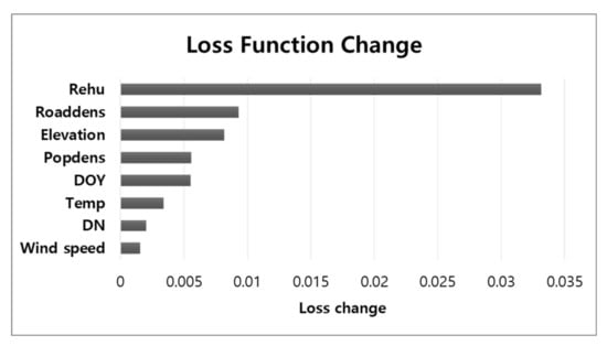 Figure 4 shows the feature importance identified by the integrated model based on the Loss function change. Rehu, Roaddens, Elevation, Popdens, and DOY in order were the top five contributing variables identified by Catboost. The most important variable was Rehu, which has been proved as a very useful and relevant variable representing dry weather conditions and dead fuel [20,60,61]. Rehu had a clearly opposite relationship with the number of forest fire cases considering their diurnal and seasonal patterns. Rehu has a peak in the dawn and decreases in the afternoon, and has a peak in summer and a decreasing pattern in winter and spring. The Pearson correlation coefficient of Rehu with HFRI was −0.8. Except for Rehu, contributing variables were closely related to accessibility, especially for the Roaddens, Elevation, and Popdens. The Pearson correlation coefficients of the three variables with HFRI were 0.4, −0.4, and 0.3, respectively. This agrees with the fact that most forest fire cases have occurred due to anthropogenic factors. The forest areas with high Roaddens, low Elevation, and high Podens have relatively high accessibility, which is vulnerable to forest fires [27]. DOY moderately contributed to the model. DOY is an effective factor for modeling the seasonality of forest fire risk: frequent forest fires in the dry season (spring and winter), while less in wet summer [62].