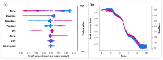 Figure 5b shows how Rehu works in the model depending on the Roaddens feature value. The SHAP value was close to 0 when the Rehu value was near 50. If the Rehu had a moderate value, a static forest fire risk map might be generated since the prediction was mostly determined by Elevation, Roaddens, and Popdens. The interaction between the Rehu and the Roaddens changed from the Rehu feature value of 50. When the Rehu was less than 50, it had a larger positive SHAP value with the low Roaddens. This is because if the Rehu was low and the road density was high, both features have the same direction to high forest fire risk, which leads to the relative reduction of the Rehu’s contribution. However, if the Roaddens was low despite the outbreak of a forest fire, the contribution of low Rehu would increase. This means that the contribution to the prediction varies depending on the feature value and the interaction between features.