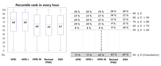 HFRI was compared to the revised FFMC and DWI using the percentile rank. To confirm the spatial accuracy, the percentile ranks of the forest fire pixels were calculated targeting all forest pixels every hour. Even if the indices (i.e., HFRI and DWI) have different ranges and distributions, since each index is spatially ordered for every pixel, it can be used to compare them which one is better at the discrimination between forest fire (representing high risk) and non-fire locations. For example, the percentile rank value of 95 means that the pixel is at the top 5% among all forest pixels at that time. Figure 6 shows the box plot of the percentile ranks of forest fire pixels.