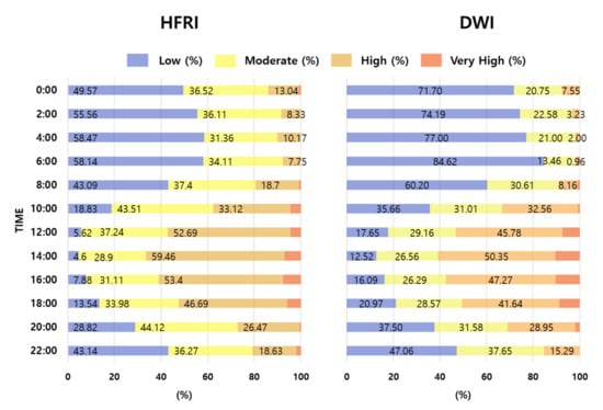 HFRI and DWI classes by the time with two hours interval. The total sum of each time for each index is 100%, indicating how many forest fires fall into this class as a percentage form.