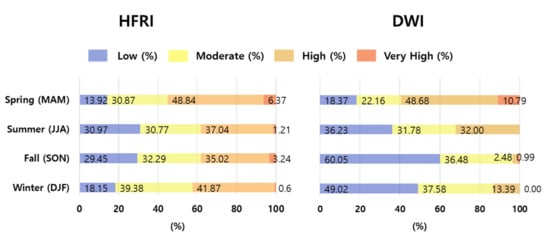 HFRI and DWI classes by season. The total sum of each time for each index is 100%, indicating how many forest fires fall into this class as a percentage form.