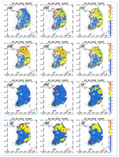 HFRI (a–f) and DWI (g–l) maps with the two-hour interval in winter. The black dots are forest fire locations. There were three forest fires in February 26, 2016: (A) Gwangju during the 9:55–18:00 KST, (B) Chuncheon during the 14:43–15:35 KST, and (C) Yeongwol during the 15:40–16:15 KST. HFRI was masked using a forest land cover type to produce results only in forest regions in (a–f). If there are missing values in DWI, they are displayed as No data (white color).