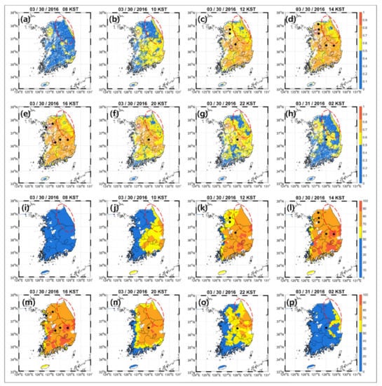 HFRI (a–h) and DWI (i–p) maps in spring. The black dots are forest fires. There are seven forest fires. If there is no data due to the missing data from DWI, the next time data was used. Thus, the map was displayed as a time series at intervals of 2 or 4 h.