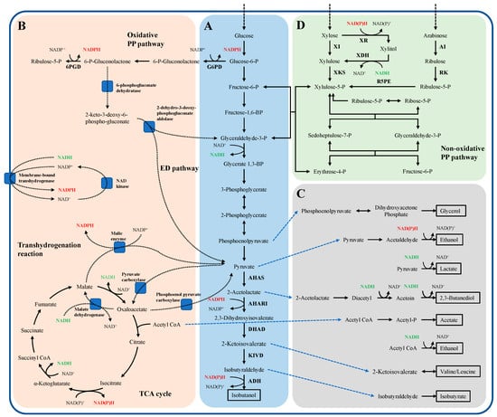 Schematic diagram of microorganism isobutanol synthesis pathways. Part (A) shows the general pathways of isobutanol biosynthesis; Part (B) shows a partial cofactor balancing strategy for successful optimization of isobutanol synthesis; Part (C) shows the common by-product synthesis pathways of isobutanol synthesis; and Part (D) shows the sugar metabolism pathway using non-glucose fermentation to produce isobutanol. The dashed line indicates the source of the precursor substance for the byproduct; AHAS: Acetolactate synthase; AHARI: Acetohydroxyacid reductoisomerase; DHAD: Dihydroxyacid dehydratase; KIVD: Keto acid decarboxylase; ADH: Alcohol dehydrogenase; G6PD: Glucose-6-phosphate dehydrogenase; 6PGD: 6-phosphogluconate dehydrogenase; XR: Xylose reductase; XDH: Xylitol dehydrogenase; XI: Xylose isomerase; XKS: Xylulokinase; AI: L-arabinose isomerase; RK: L-Ribulokinase; R5PE: L-Ribulose-5-P-4-epimerase.