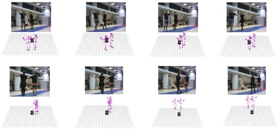 Figure 2 show the humans’ joints extracted both on RGB content (the first and the third row of Figure 2) and on a plane depicting the movement of the dancers in the space (second and fourth row of Figure 2). Since we have two dancers executing the choreography, it is clear that severe occlusions and merges are encountered, mainly due to the 3D geometry of the dancers. This is the case, for example, of the fifth and sixth frame of Figure 2 where one can notice, by observing the frame content, that only one dancer appears to perform.