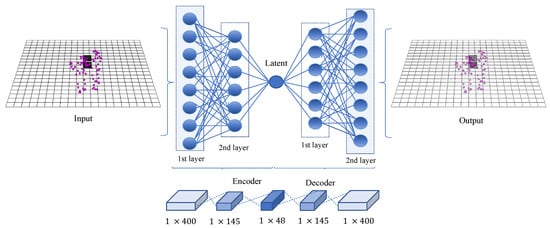 The core idea of our SAE representation is to capture a meaningful content of the main patterns of the raw data inputs by discarding any redundant information, that is, any outlier in data samples which will not be justified well using that representation. The learning process is described simply as minimizing a loss function over a training set. But since no desired outputs are required, the whole process is unsupervised. That is, the desired outputs are the same with the inputs. The final results will be a representation of low dimensionality of the input data. Thus, an SAE works similar to a Principal Component Analysis (PCA) but under a non-linear framework. Figure 4 depicts the proposed SAE approach for input data dimensionality reduction. In the following Section 4, we analyze with more details the SAE structure adopted in this article.