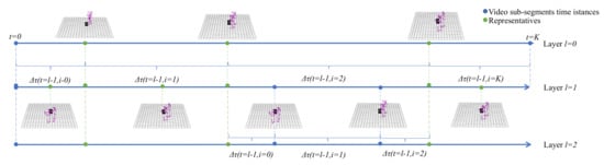 The traditional SMRS algorithm is sensitive to temporal redundancies. Therefore, it fails to model the temporal dependencies of a choreography. To overcome this difficulty, we have introduced in Reference [6] a hierarchical decomposition scheme of the SMRS algorithm which first detects time intervals on which further decomposition takes place so as to create hierarchies of the key frame representatives. Thus, hierarchical SMRS segments the initial feature space into suitable sub-spaces that better model the choreography. The proposed H-SMRS is able to efficiently describe more complicated choreographic patterns, since the feature fluctuation within a sub-time interval (sub-space) is less than the fluctuation of the entire feature space of the sequence. Figure 5 presents an example of the hierarchical decomposition framework (H-SMRS). At the first layer, three representatives are extracted to model the whole video sequence (marked in green). Therefore, the initial video sequence is decomposed into four further sub-sequences (intervals), since the first and the last frame are also considered as representatives. Then, we assume that the third out of the fourth video sub-sequences. that is the interval , is further decomposed. expresses the first layer at the second sub-sequence (interval). For this reason, the SMRS algorithm is applied within the interval for extracting representatives that best fit the frames of this interval. In this example, two representatives are identified, again marked in blue color at layer 1. Therefore, the video segment of is further decomposed into three more sub-segments. This procedure is iteratively applied until the decomposition criterion identifies that no further decomposition is required.