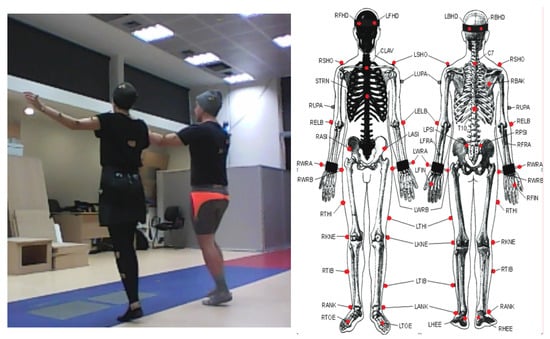 The heart of the acquisition module adopted for modelling the dancers’ motion trajectories in 3D space is based on the VICON Motion Capturing System. In our implementation, ten Bonita B3 cameras are used, running the Nexus 1.8.5.61009 h software. The movement area is 6.75 m. The origin of the VICON coordinate system is the centre of the square surface. A wand with markers is used to calibrate the ten cameras. User body is measured by attaching passive markers on it at fixed positions for each dancer. After sticking all the markers, the height, weight and other specific anthropometric characteristics of the users are measured (see Figure 6). The data sets contain three recordings from Greek folklore dances, performed simultaneously by two professionals. We chose male and female expert-dancers since for those particular dances, the choreographic performance between men and women is slightly different. Specifically, men dance proud and imperious, while women modest and humble. On the contrary, dance style differences among professionals of the same gender are slight and mainly due to the personality of the dancer and how she/he executes the predefined choreographic performance.