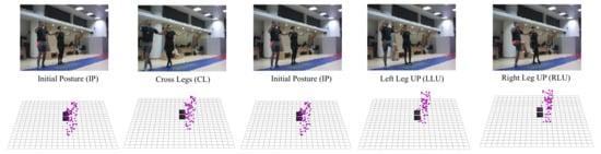 In Table 1, we also present a brief description of the dances along with their main steps. These steps have been defined by the dance experts who have designed the whole choreography and refer to the main variations of the dance as acquired through the VICON capturing module. Thus, the main steps of the dance in Table 1 do not refer to the steps of the choreography as being taught to a dancer trainee but to the main “activities” of the dance as being captured by the digitization unit. For instance, Sirtos (3-beat), consists, in its digital space, of six main choreographic units; (1) Initial Posture (IP)—the dancer faces a forward position; (2) Cross Leg (CL)—the dancer crosses the legs as she/he is moving, the left leg is in front of the right; (3) Initial Posture (IP)—again the dancer faces a forward position; (4) Left Leg Up (LLU)—the dancer rises her/his left leg up; (5) Initial Posture (IP)—after lowering her/his leg, the dancer is again in an in front position; (6) Right Leg Up (RLU)—the dancer rises her/his right leg up (see, Figure 7). Then, the main patterns of the dance stop and the choreography starts from scratch.