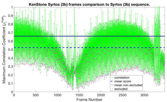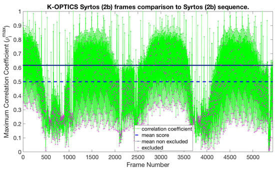 In this sub-section, we present some results of different summarization algorithms on the above-mentioned dance sequences. In particular, Figure 8 demonstrates the results obtained on Syrtos (2 beat) dance sequence, consisting of more than 5000 frames, using as summarization algorithm the K-OPTICS. More specifically, we extract 32 key-representatives using the K-OPTICS algorithm and then we calculate the maximum correlation score for each frame of Syrtos (2 beat) dance sequence against the 32 key frames extracted [see Equation (5)]. As shown in Figure 8, the average for all 5000 frames (that is for all ) is 0.5 with a variance of 0.25, which is a relatively low score. However, as we have stated previously, some frames of the dance sequence have been erroneously encoded mainly due to the simultaneous presence of two dancers in the choreography and the dense occlusions this causes. Thus, if we refine the frames of the dance sequence by excluding the ones whose the joint coordinates between two consecutive frames present high differences, greater than a threshold (in our case the threshold is set to 20% rate of change in joint’s coordinates, for more than 20% of joints), then the correlation score is significantly improved. In particular, in this case the average for all 5000 frames becomes more than 0.6, indicating a good summarization ability. Additionally, the majority of excluded frames, shown as purple crosses in Figure 8 can be found bellow the average similarity score. Such an outcome suggests that the applied rules for corrupted frames removal are adequate for the problem at hand.