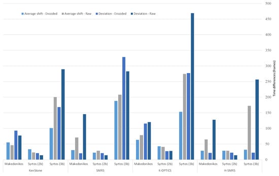 In this figure, we also compare the performance derived against the four summarization methods; that is, K-OPTICS, Kennard Stone, SMRS, and the proposed hierarchical SMRS, H-SMRS. As we can observe from Figure 10, the H-SMRS gives the best performance for all dances with a deviation around 50 frames (or, approximately, 0.41 s), when encoded frames are used as inputs. The H-SMRS scheme also provides much better performance for the Syrtos(3b) dance, which seems to be more complicated than the other two dances, resulting in higher time deviations for the rest of the samplers. It is also worth mentinign the complex effect of coupling different features and samplers. For example, Syrtos(2b) input type does not affect significantly the performance for all four samplers.