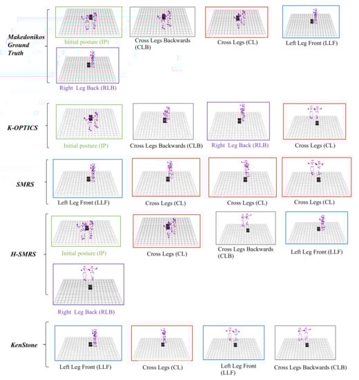 Figure 11 provides further insights on the similarity among extracted key frames, using summarization algorithms, and some user annotated (selected) key frames. This allows us to visually judge on the similarity between the key frames extracted by the summarization algorithms and the ground truth ones. The results demonstrate five basic postures from Makedonikos dance. Then, for each the four summarization approaches, we select the closest frame to the user annotated posture of reference. As is observed, H-SRMS selections are closer to the experts’ defined key frames, compared to K-OPTICS, SMRS, and KenStone approaches.