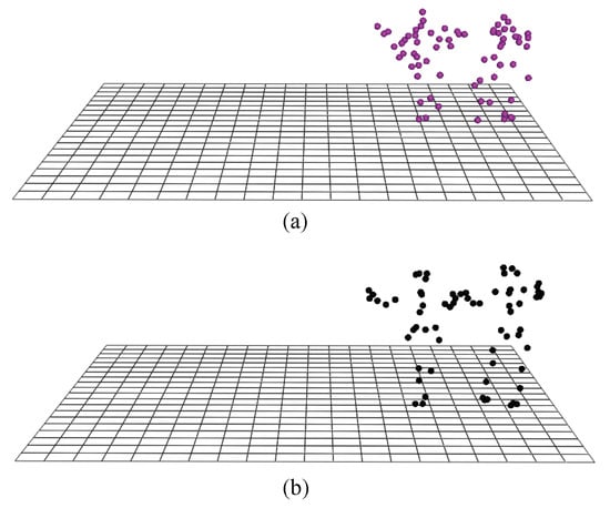 In the following, let us denote as the k-th joint out of the M extracted by the Vicon architecture for each dancer for the t-th frame of the dance sequence. In our case , that is, 40 joints are extracted per human dancer. Variables , and indicate the coordinates of the k-th joint with respect to a reference point setting by the VICON architecture (in our case the center of the square surface) for the t-th frame. These joints have been obtained after the application of a density-based filtering on all the detected joints to remove noise from the acquisition process (see the third paragraph of Section 6). This noise becomes apparent when multiple dancers are performing in the choreography.
