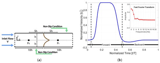 Figure 1a shows the leaflets and channel layout. The top and bottom boundary walls of the channel are separated by a distance of 2 h, where h = 15 mm; both walls present a non-slip boundary condition, and the length of the channel is 20 h. The experimental setup considered a 3D environment where the width of the channel was