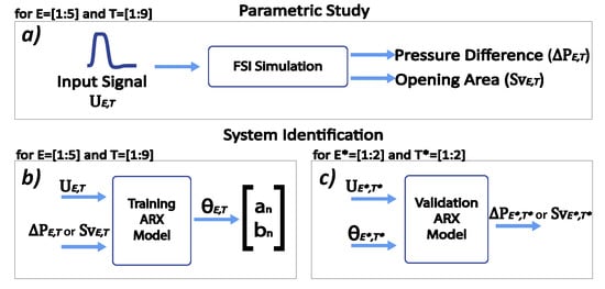 Given previous considerations, the underlying aim of this paper is to introduce the first attempt to apply an SI method—usually employed for signal analysis—to simulate the opening area and pressure difference outputs from an FSI simulation of two rectangular leaflets moving as a consequence of a pulsatile flow. First, the model has to be trained with existing data, and then, when the coefficients for the model are obtained, we use bilinear interpolation to create new coefficients for specific conditions and then simulate a new output. The main purpose is to help researchers still obtain an accurate trend of the phenomena studied, and it is not intended to substitute the current FSI simulation method, but to complement it when time is critical and only a few parameters change between a set of situations, such as the time, the frequency of the fluid, the elastic modulus, and so on. The dataset to train the model is retrieved from an FSI parametric study (which consists of variations in the mechanical properties of both the fluid and solid domain of the leaflet structure). It is essential to point out that this work does not represent an exact mimicking of the flow moving across a native heart valve, nor does it produce or use real clinical data. Besides, we are considering the simplest representation of a valve model to reveal the basics involved in the opening and closing stages of the leaflets. In this manner, the data we are using from the FSI simulations are the result of our simple leaflet structure and are only intended to be used as a reference point for our ARX model characterization and to guide future research.