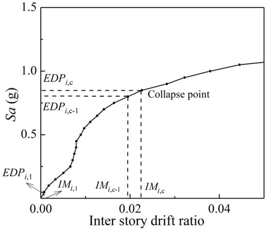 where and are the earthquake intensities of the structural collapse point and the point on the IDA curve before the collapse point for ith story, respectively; is the TR of the ith story; is the tangent slope of the collapse point and the step before the collapse damage state on the IDA curve for the ith story; is defined as the initial slope of the IDA curve of the ith story; and are the seismic demands of the ith story under the ground motion intensity and , respectively; and the and are the seismic intensity and the seismic demand of the ith story at the first step of IDA, separately. Referring to the evaluation of structural collapse in FEMA P695 [43], the structure collapses when the TR reduces to less than 20%.