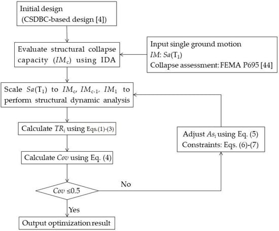 - If the value of Cov reduces to a pre-determined target value, that means the code-based structure has a relatively uniform TR distribution along the height of the building while the structure collapses, and no redesign is needed; otherwise, an iterative procedure is proceeded, where the longitudinal steel reinforcement of columns is sequentially modified using Equations (5) and (6) until the value of Cov reduces to small enough (e.g., less than 0.5).where and are the dimension of the longitudinal steel reinforcement for one column on the ith floor at the jth and (j − 1)th iteration, respectively; is the TR of ith floor at (j − 1)th iteration; is the average of TR of each floor at (j − 1)th iteration; and α in Equation (5), which controls the convergence gradient, is a coefficient ranging from 0 to 1. Based on the previous studies [22,23,24,25,26,27,28,29], α is set as 0.02 for this study. In order to keep the same construction cost, the Equation (6) is utilized to adjust the sum of longitudinal steel reinforcement of candidate design to that of code-based structure. is the sum of ; is the sum of longitudinal steel reinforcement for a code-based structure; is the updated dimension after scaling the optimized results to the sum of longitudinal steel reinforcement for a code-based structure.