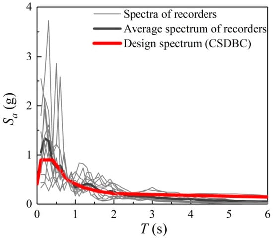Considering the uncertainty of an earthquake, at least 11 ground motion records are required according to ATC-58 [45] to develop relatively accurate seismic demands of the buildings. Incorporating the seismicity characteristics of the assumed site, a number of 11 earthquake records, listed in Table 2, were selected from the 22 far-field ground motions involving 44 horizontal earthquake components recommended in FEMA P695 [43]. The referent earthquake database has been thoroughly selected for a reasonable representation of the randomness of strong ground motions that may lead a building to the collapse damage state. To comprehensively consider the design spectrum matching and soil–structure interaction and to avoid specific earthquake event dominant-based bias during the selection process, this record group is generally employed for the seismic collapse assessment of buildings. Details of this referent record group are explained in FEMA P695 [43]. As shown in Figure 4, the average spectrum of the selected 11 ground motions is well matched to the design spectrum of severe earthquake intensity in CSDBC [4].