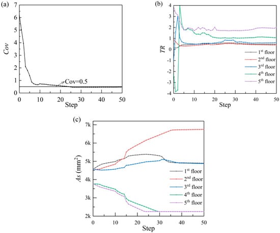 The CSDBC-designed 5-story RC frame structure is optimized, implementing the proposed optimization method subjected to a ground motion (San Fernando, 1971, RSN68). Figure 5 illustrates Cov, TR for each floor and the longitudinal reinforcement dimension of single columns for each floor from the CSDBC-designed structure tending to the final optimization design. As shown in Figure 5a,b, the proposed method eventually converges on a near-uniform distribution of TR until the variable coefficient of TR meets the constraint requirement with few iterative loops. It should be classified that the value of TR sometimes is negative, which results from the non-monotonic and back-and-forth twisting behaviors of the IDA curves. Further elaboration of these behaviors can be found in the original investigation of IDA [45]. It is shown in Figure 5c that the longitudinal reinforcement dimension of single column on the fourth and fifth floors eventually converged on the minimum reinforcement based on the constraints in CSDBC [4]. It indicates the necessity of the consideration of the constrained provisions in the optimization procedure. During the optimization procedure, the reinforcements of the fourth and fifth floors are gradually transferred to the first three floors with most materials being moved to the second floor.