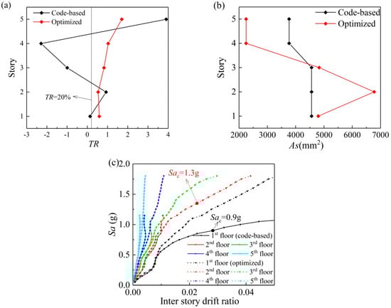 The TR distributions along the height of the code-based structure and optimized structure (reinforced using the steel bars in commerce) under the ground motion intensity relating to the collapse damage of the code-based structure subjected to the selected 11 ground motions are compared in Figure 8. As for the optimal design structure, the TR values of all the stories are larger than 20%. This means the optimized structure does not collapse at the collapse intensity of the initial structure; and it leads to a more uniform distribution of the TR along the height of the building. This phenomenon implies that the potential of the materials has been optimally exploited using the optimization design.