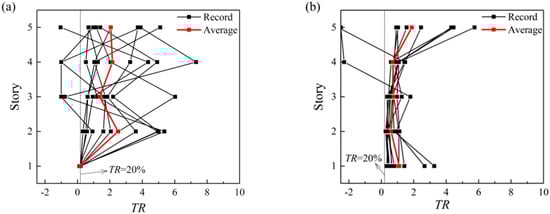 TR distribution comparisons of CSDBC-designed structure and optimized structure: (a) TR distribution of code-based structure at the earthquake intensity corresponding to collapse state of code-based structure, (b) TR distribution of optimized structure at the earthquake intensity corresponding to the collapse state of code-based structure.