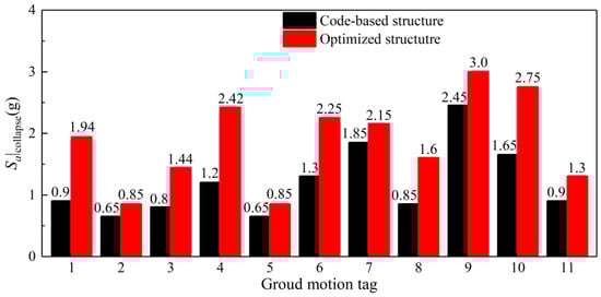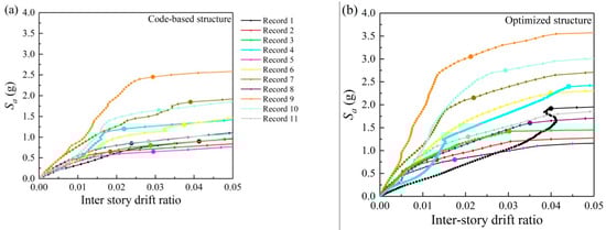 The IDA curves and collapse points of the initial structure and the optimal structure under the selected 11 earthquake records are illustrated in Figure 9a,b, respectively. Visually, the IDA curves of the initial structure turn relatively more horizontal than the IDA curves of the optimized building during the inelastic deformation range. This phenomenon means the initial structure develops more deformations than that of the optimized structure under the same earthquake intensity. As the reinforcements are modified from floors with large TR to floors with small TR, the floors with small TR are strengthened. The original collapse floors can resist the earthquake intensity of the collapse for a code-based structure. Figure 10 shows the collapse capacities of the structure before and after optimization under the selected earthquake set. Compared to the code-based structure, the proposed refined seismic design method results in a significant increase of the structural collapse resistant capacity with a maximum increase by 115.6% (ground motion: No. 4), a minimum increase by 16.3% (ground motion: No. 2 and No. 5), and an average increase by 60.9%, while the construction cost is almost unchanged (the sum steels dimension of all columns for the optimized structure is less than that of the initial structure by 0.4%). After optimization, the mean collapse capacity of the structure is increased from 1.2 g to 1.87 g by 55.7%. Briefly, the proposed optimum seismic design method increases the collapse resistant capacity largely compared to the code-based design method, while the maximum inter-story drift is reduced and the construction cost remains the same. As shown in Figure 10, the collapse capacity of the optimized structure increases for each ground motion record. It implies the proposed method has good robustness.