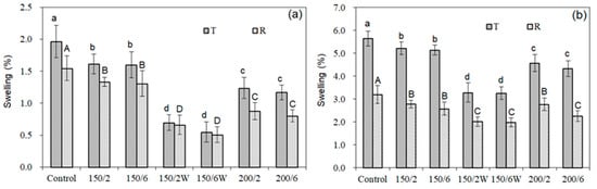 Water adsorption swelling (a) and water absorption swelling (b) of the control and modified groups in the tangential and radial direction. Bars showing different letters demonstrate significant difference (p < 0.05) according to Duncan’s multiple range tests.