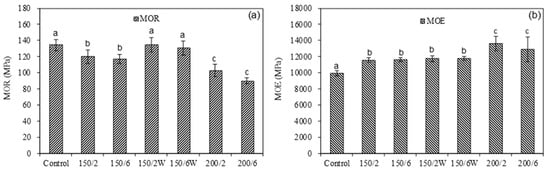 MOR (a) and MOE (b) of the control and modified groups. Bars showing different letters indicate significant difference (p < 0.05) according to Duncan’s multiple range tests.