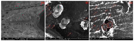 SEM observations of the control samples (a), wax impregnated samples (b), and cutting slices (c). Red arrows indicate wax with shaped droplets, and red circles show the layers of wax formed.