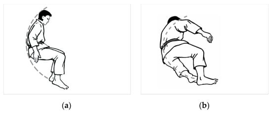 When selecting groups, assumptions were made similar to the ones in Mroczkowski’s research []. The study involved 57 physical education students at the University of Zielona Góra, aged 19–26 and divided into two study groups. Group A consisted of 32 students who claimed that they had not practiced any sport in a sports club. Group B consisted of 25 students who, by practicing martial arts, mainly aikido during extracurricular activities, had acquired the skill of a fall performed backward with side aligning of the body. In group A, the students were 175 ± 4.9 cm tall, their weight was 80.3 ± 7.1 kg; in group B they were 173 ± 5.3 cm tall and their weight was 81.7 ± 8.1 kg. There were no selection criteria for the research groups in terms of students’ weight and height—the selection was random. The only selection among students was made in terms of the already-acquired method of falling as well as the exclusion from the research in cases of making the “hands” error []. The research was carried out from 2015 to 2019. It was conducted in accordance with the Declaration of Helsinki, and its protocol had been approved by the Commission for Bioethics at the Regional Doctors’ Council in Zielona Góra (4/55/2014). All respondents gave their written consent to participate in the research. The group A students fell down through the RTS using the technique similar to the gymnastic backward roll. (Figure 1a). Students from group B adopted the fall performed backward with side aligning of the body technique (Figure 1b).