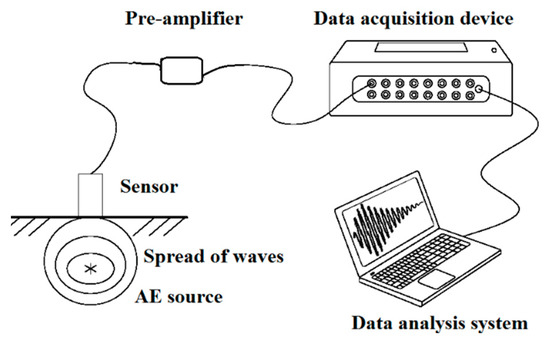 The AE monitoring technique consists of four parts: the sensors, the pre-amplifiers, the data acquisition device, and the data analysis system. Figure 5 shows the principle of the AE monitoring technique [28,29]. The elastic waves emitted from the AE sources eventually transmitted from inside to the surface of the material, causing surface displacements that can be detected with AE sensors. The elastic waves are translated into electrical signals through the AE sensors. Then, they are acquired by the data acquisition device after being processed by the pre-amplifiers. Finally, the signal is analyzed by the data analysis system [30,31,32,33,34].