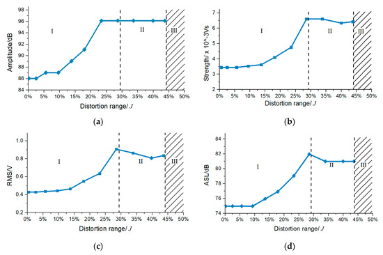 Table 2 lists the variations of the amplitude, the signal strength, the RMS, and the ASL as varies from 0 to 43.64%. As we can see, the parameters of the AE signal increased with the uniform increase of distortion range in real-time.