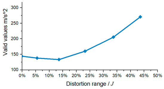 In the same experiment, the vibration monitoring technique was tested to study the inlet distortion of the engine as well. Figure 7 shows the relationship between the parameters of the vibration monitoring technique (taking the valid values as an example) and . When reached 14%, the parameter of vibration monitoring technique begins to show a clear upward trend, lagging behind the response of the AE monitoring technique, demonstrating that the AE technique is more sensitive to the identification of inlet distortion.