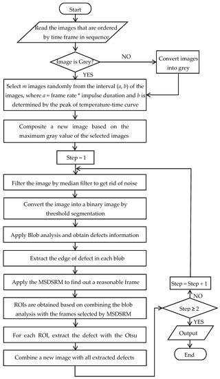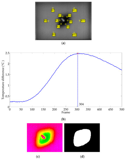 Note that there are two mechanisms that further guarantee the proposed ADD algorithm is fully automatic without the need of operator intervention for the selection of thermal frame image for processing, nor the need to determine the ROI (region of interest) dimension for defect diagnosis. Firstly, the MSDSRM selects suitable thermal frames for defect extraction, as described in this section. Secondly, the blob analysis has three functions as follows: (i) The blob analysis offers the basic information such as the defect distribution and the total number of defects; (ii) The edge of the defect in a blob can help locate the exact location of the sensitive areas. (iii) The blob analysis in conjunction with the MSDSRM allows the determination of the ROI for defect segmentation.
