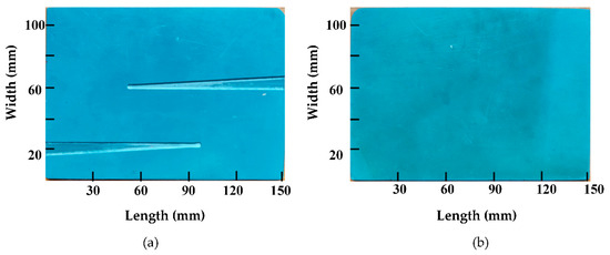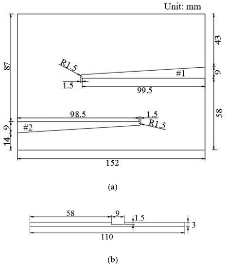 A PVC plate that has two flat-bottomed defects artificially fabricated at different depths is used as the main specimen in this paper (see Figure 5). The PVC has dimensions of 152 mm × 110 mm × 3 mm, and the two defects #1 and #2 have maximum width of 9 mm and 3 mm width at the narrow point with a semicircle tip with a diameter of 3.00 mm, as shown in Figure 6. The lengths of #1 and #2 grooves are 101 and 100 mm, respectively. The depths of #1 and #2 defects are 1.50 and 1.00 mm, respectively.