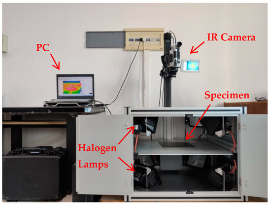 The synchronized infrared image acquisition system that has been employed in this work is schematically illustrated in Figure 7. The infrared imager in the system is an uncooled InfraTec VarioCAM® HD980 (made in Germany) with a detector resolution of 1024 × 768 and a maximum acquisition frequency of 30 Hz. The excitation source is composed of four 400 W halogen lamps. The controller controls the synchronization of excitation and acquisition. During the process of the experiment, the halogen lamps are triggered by software to generate pulsed radiations toward the test object. The infrared camera is simultaneously triggered to start recording as soon as the pulsed radiation is initiated.