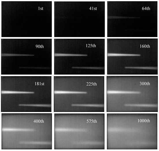 As shown in Figure 7, the infrared sequence was captured by a transmission mode, where excitation and an IR camera are located on the opposite side (the four halogen lamps in the bottom of the excitation box are used as the excitation sources). Figure 8 depicts samples of the 1000 frames of thermograms acquired at a frame rate of 30 Hz after a 3 s of heat pulse is irradiated toward the specimen, as described in Section 3.1. The heating and the cooling process can be seen vividly from Figure 8. It is seen that the thermal accumulation at the defects #1 and #2 began to appear at the 41st and 64th frames, respectively. Both defects can be seen clearly from the 125th to 225th frames, and their edges are subsequently seen to diffuse away at about the 575th frame.