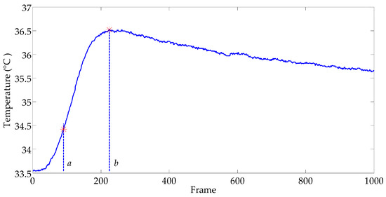 Ahmed Kabouri [6] adopted the maximum temperature elevation method (MTEM) to obtain a frame image from a sequence of thermal image for image processing. He thought that only the image acquired when the temperature reaches its maximum elevation is considered, i.e., at the time tmax corresponding to the maximum of transmitted heat and therefore a maximum of information. Using MTEM, Frame 385 was selected based on the peak of the curve of temperature elevation over time, which is presented in Figure 27. However, at Frame 385, the image has obvious heat diffusion and the defect tip has disappeared, so it is obviously not a suitable frame. Therefore, this method is not suitable for processing our sequential images.