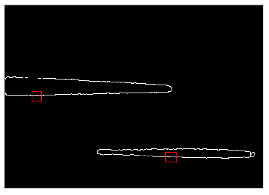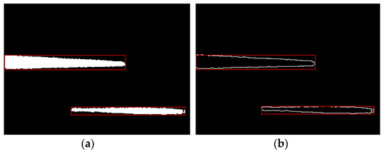 The blob analysis is used in the binary image, Figure 11b, by the blob analysis package in MATLAB. Defect regions are divided as blobs marked as red rectangles in Figure 12a. Features such as area (i.e., the number of pixels), center of gravity, or the orientation of a blob or blobs are calculated. Each blob contains one defect that is abstracted as a whole or portion (see the white line in Figure 12b). Moreover, a blob and a defect are one-to-one correspondence, so we can deal with blobs in turn equaling the process defects one by one. At last, the edges are abstracted by a canny operator for the further localization of the sensitive region.