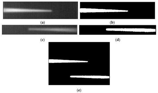 The ROIs for each defect are determined as shown in Figure 16a,c, which are selected by the MSDSRM. After a median filter, defects #1 and #2 are respectively extracted by automatic threshold segmentation with the value of 4.6 and 3.6 determined by the Otsu method, as shown in Figure 16b,d. The relative errors are 2.08% and 2.91% for defects #1 and #2 respectively, as seen in Table 2. The value of threshold is important in image segmentations, which can influence the integrality and veracity of the results. The Otsu method based on the maximum of between-cluster variance is always considered an optimal method of thresholds for automatic selection. It will divide the processing image into two categories, i.e., background and objectives. The optimal threshold is obtained by searching the maximum between-cluster variance. Comparing the data in Table 1 and Table 2, the threshold changes very little from 0.47 to 0.46 for #1 and to 0.36 for #2, but the error of defect #1 decreases from 27.08% to 2.08%, and the error of defect #2 reduces to 2.91%, which is incomplete extraction after processing the full image, as shown in Figure 11b. At last, the two segmentation images are combined as a whole (see Figure 16e). The semicircular arc of the defect tip can be extracted accurately.