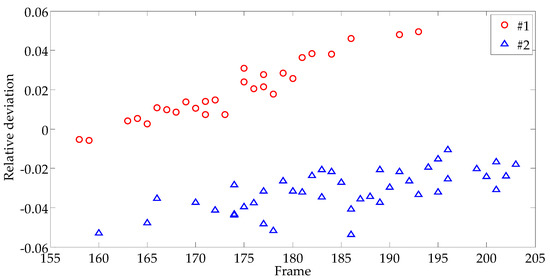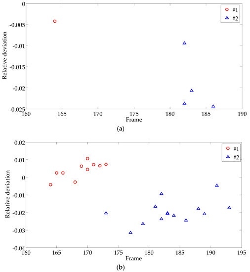 To assess the performance of primary detection results, 100 independent experiments were conducted to extract each defect. Each composition image was synthesized by 10 random frames from the interval (90, 224) of the infrared sequence, and the location and size of the sensitive regions in each experiment were randomly selected, too. Figure 17 shows the discrete distribution map of the deviation of the extracted defect area from the ground truth. The symbols “Ο” and “Δ” in the figure represent defects #1 and #2, respectively. From the figure, we can see that the frame selected by MSDSRM ranges within (155, 205) less than 50 frames. We have obtained a very narrow range from the original image sequence of 1000 frames, so it is a good primary detection. Defect #1 is the shallow defect, and there is a tendency that the relative error gradually increases with time. However, there is no regularity for #2. Moreover, there are serious overlaps of frames for different defects at different depths. There are two reasons for this phenomenon: one is that the edge extracted from the composite image is not the exact boundary of the defect, especially for the deep one shown as Figure 11b, which is smaller than the true; the other is that single sensitive region chosen randomly is not always representative of the whole standard deviation around the defect due to the non-uniformity of excitation. Under the same excitation, the heat transmission speed in the defect area varies with the burial depth. For the defect with a shallow burial depth, the corresponding surface temperature rises faster, taking less time to form a temperature difference area coinciding with the defect shape. In contrast, the defect with a deeper burial depth takes more time to form a temperature difference area coinciding with the defect shape. The best image for processing defect #1 should be a frame in sequence ahead of that for processing defect #2. So, the results of primary detection should be improved further to maintain the results’ robustness.
