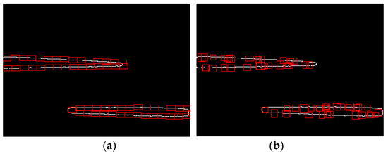 - Uniform selection (Figure 18a): sensitive regions are followed one by one along the edge of the defect. The total number of sensitive regions is determined by the perimeter of the defect extracted at the primary detection. The size of the sensitive region is set to 10 × 15 pixels.