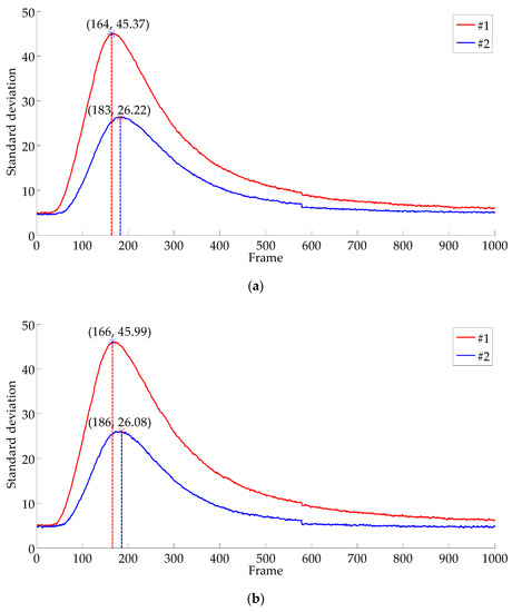 Figure 19 shows the standard deviations for the two defect regions for the whole set of the infrared image sequence (1000 frames). The results yield smother curves than the traditional measurement (see Figure 14), and the peak value of a given curve becomes easier to identify. For example, for uniform selection (Figure 19a), defect #1 reaches its peak standard deviation 45.37 at Frame 164, while defect #2 reaches its peak standard deviation 26.22 at Frame 183; for random selection (Figure 19b), defect #1 reaches its peak standard deviation 45.99 at Frame 166, while defect #2 reaches its peak standard deviation 26.08 at Frame 186.