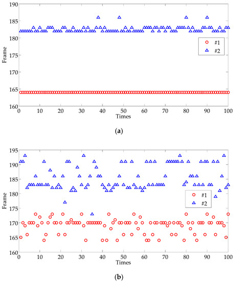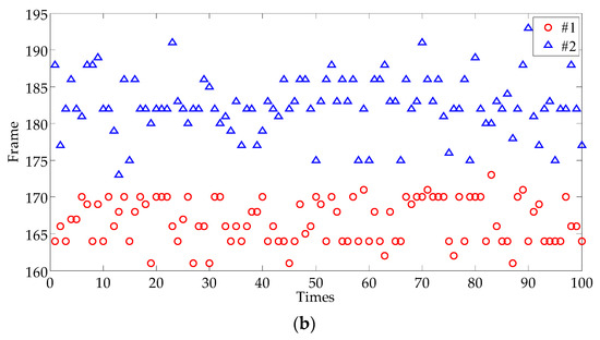 For uniform sampling, the size of each sensitive area sampling is the same, but the size is no longer fixed as the front. Instead, the size is randomly determined from 3 × 3 pixels to 15 × 15 pixels in 100 experiments. The results are shown in the scatter diagram shown in Figure 24a. Compared with the results of Figure 20a obtained by a fixed size of 15 × 10, it can be seen that the diversity of results is greater than that of previous results. Especially for defect #1, it is no longer only one value for Frame 164, and more frames are selected in the interval (161, 173). Among the results, Frame 164 and Frame 170 are chosen with large probability.