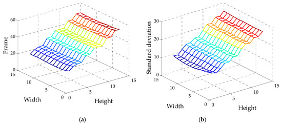 The standard deviations are calculated for every sensitive region in each image in the sequence, and the time history curves of standard deviation are obtained similar to the curves in Figure 14 and Figure 19. All peaks of the curve are collected to obtain the maximum standard deviation surface of different defects related to the sensitive regions with different widths and heights, as shown in Figure 22. Figure 22a,b are the surfaces corresponding to defect #1 and #2, respectively, and they have same shapes except that the values of standard deviation in Figure 22a are larger than those in Figure 22b. From these two figures, it can be seen that the values of standard deviation varying with height are larger than with width. It shows that the sensitive region change in height is more sensitive than in width, i.e., the direction of perpendicular to edges is much more sensitive than along the edges.