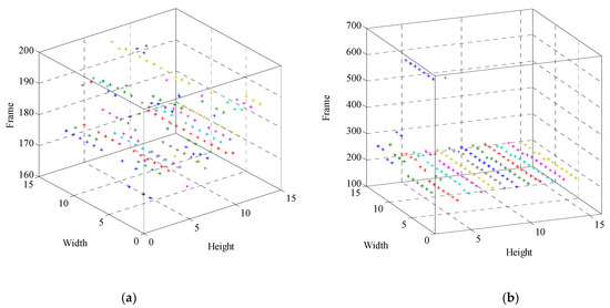 The 3D scatter diagram of selection frames with the sensitive region size variation: (a) The 3D scatter diagram of selection frames for #1; (b) The 3D scatter diagram of selection frames for #2.